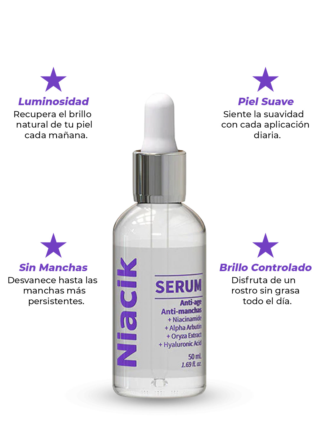 Niacik desvanece las manchas oscuras y cicatrices, dejando una piel uniforme y luminosa. Experimenta una transformación visible en tu rostro, recuperando confianza con cada aplicación.